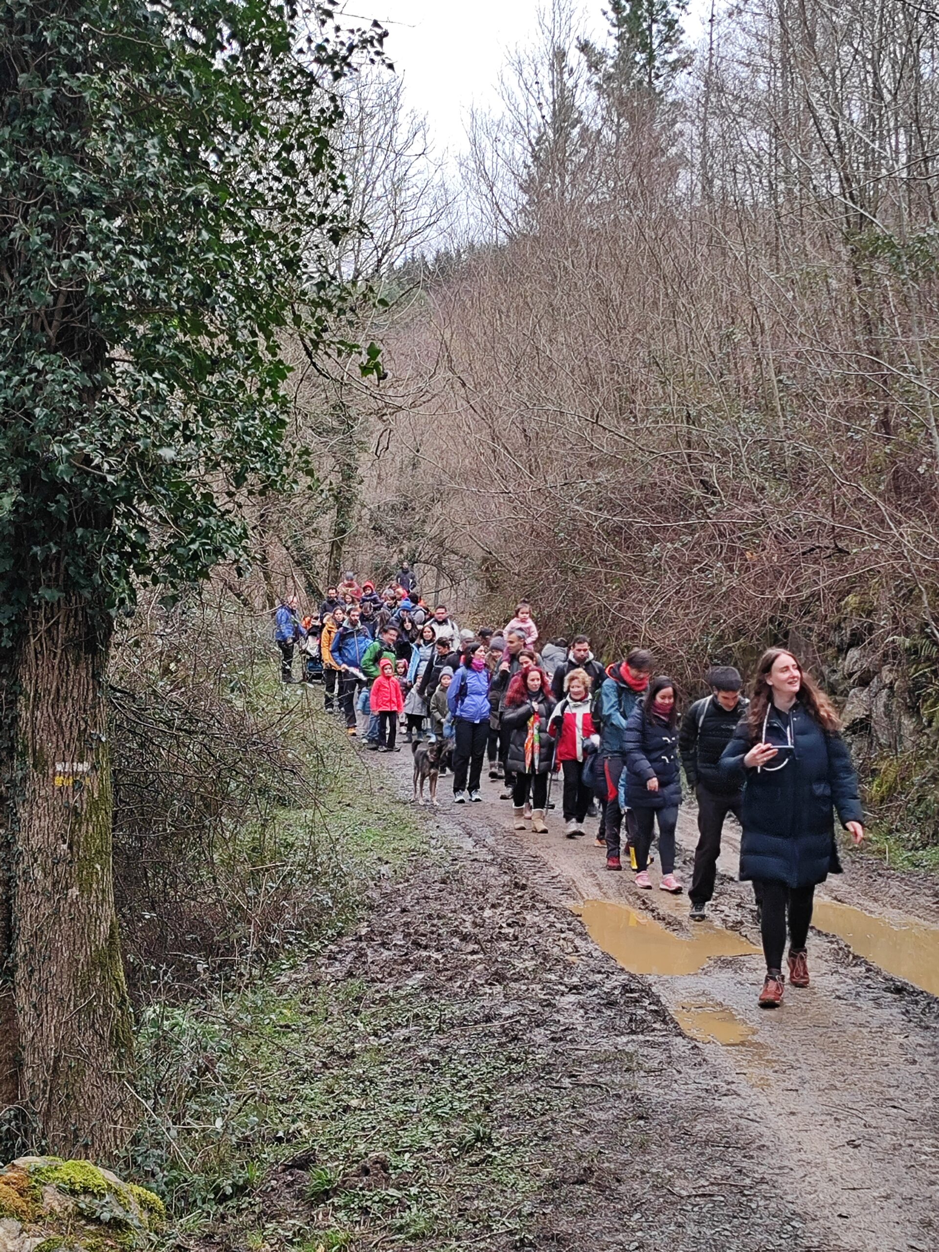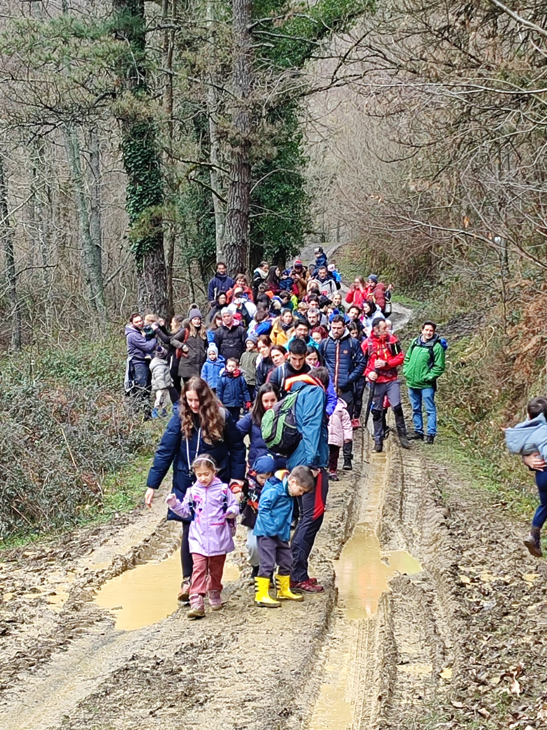 12:20 inguruan abiatu ginen. Bidea erraza da, baina aurreko egunetako euriak lokatz dezente utzi zuen. Hala ere, ez zen oztopo izan, abenturaren parte baizik. Umeek irribarrez gainditzen zituzten putzu eta lokatz guneak, eta talde osoa erritmo lasaian, elkar zainduz, aurrera egin genuen.