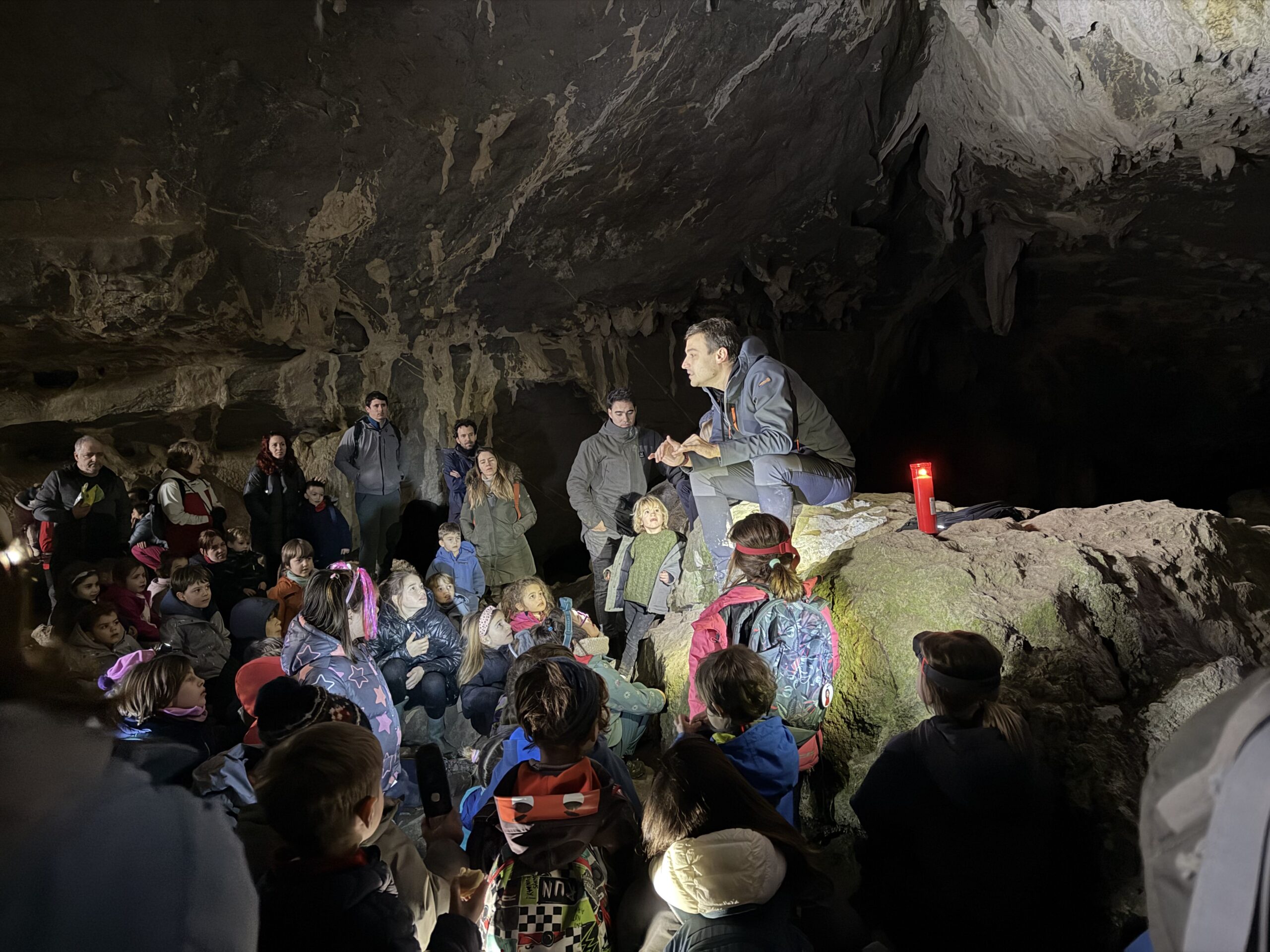 14:00etan familia batzuek autora bueltatzea erabaki zuten; beste askok, ordea, haitzuloan barrurago sartzea aukeratu genuen. Saguzarrak, estalaktitak, alboko galeriak eta antzinako su arrastoak ikusi genituen.