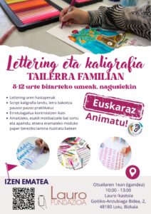 Lauro Fundazioak seme-alaba eta familien arteko harremanak sendotu eta euskarazko aisialdi-esperientzia aberasgarriak eskaintzea du xede. Ildo horretan, familian eta lagunartean egiteko Kaligrafia eta Lettering Tailerra antolatu dugu: sormena, hizkuntza eta elkarrekin ikastea uztartzen dituen jarduera, alegia.
